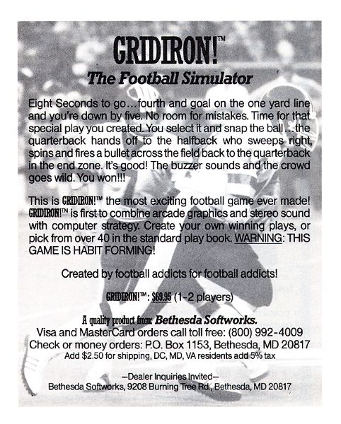 This is from "Amazing Computing" Vol.2 No.1, which I believe was January 1987. Not being a football fan, regrettably I didn't buy the game and can't offer any screen shots. Now this is what the world of Morrowind is missing - team sports!